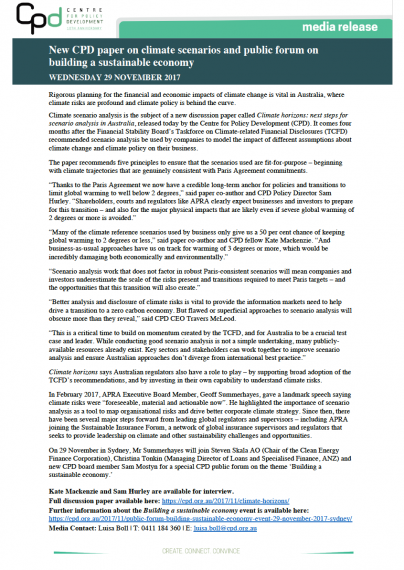 The paper is released to coincide with CPD’s Public Forum on Building a Sustainable Economy, where APRA’s Geoff Summerhayes, the CEFC’s Steven Skala, ANZ’s Christina Tonkin and new CPD board member Sam Mostyn will discuss how different organisations can help shape better near- and long-term responses to climate risk and other sustainability challenges.